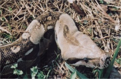 We got the snake first (Spring 1997). She is a 10 foot long Columbian Red Tail Boa Constrictor and her name is Medusa (appropriate name for a snake, don't you think?). She is very low maintenance and only needs to be fed about once a week in the summer and she doesn't eat at all from about Thanksgiving thru the first of April (she goes into a state of "pseudo-hybernation" in the winter). She used to eat live rats but as she got bigger, I had a harder time finding rats that would satisfy her. No I don't go looking in the sewers or something for them, I buy them at the pet store!! When I switched her over to frozen rats I was able to get some really big ones. I'd just thaw them out and toss 'em in the cage. I wouldn't have thought she'd eat a dead rat but I teased her with the first one (dragging it arround her cage by the tail so she'd think it was alive) and it worked. In case you're wondering, she swallows them whole.